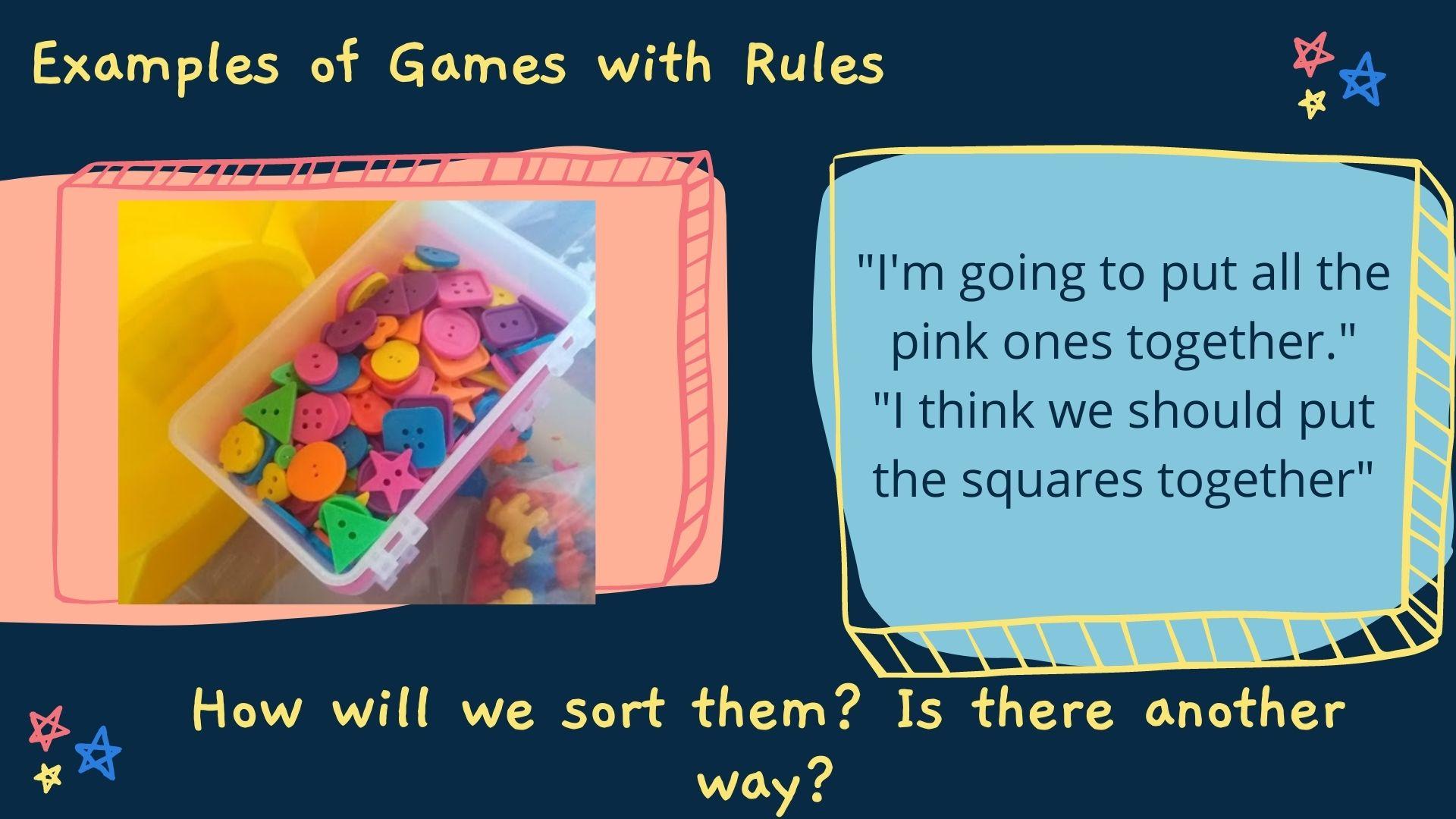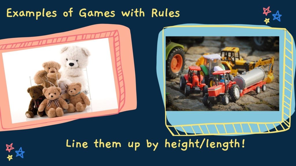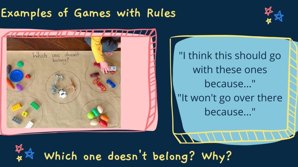 In the beginning children often play by their own rather flexible rules! In time they also partake in more conventional games with ‘external’ rules. Language is an important part of games with rules as children explain, question and negotiate the rules. Rules are often an important part of pretend play where children negotiate rules about what can and cannot be done.