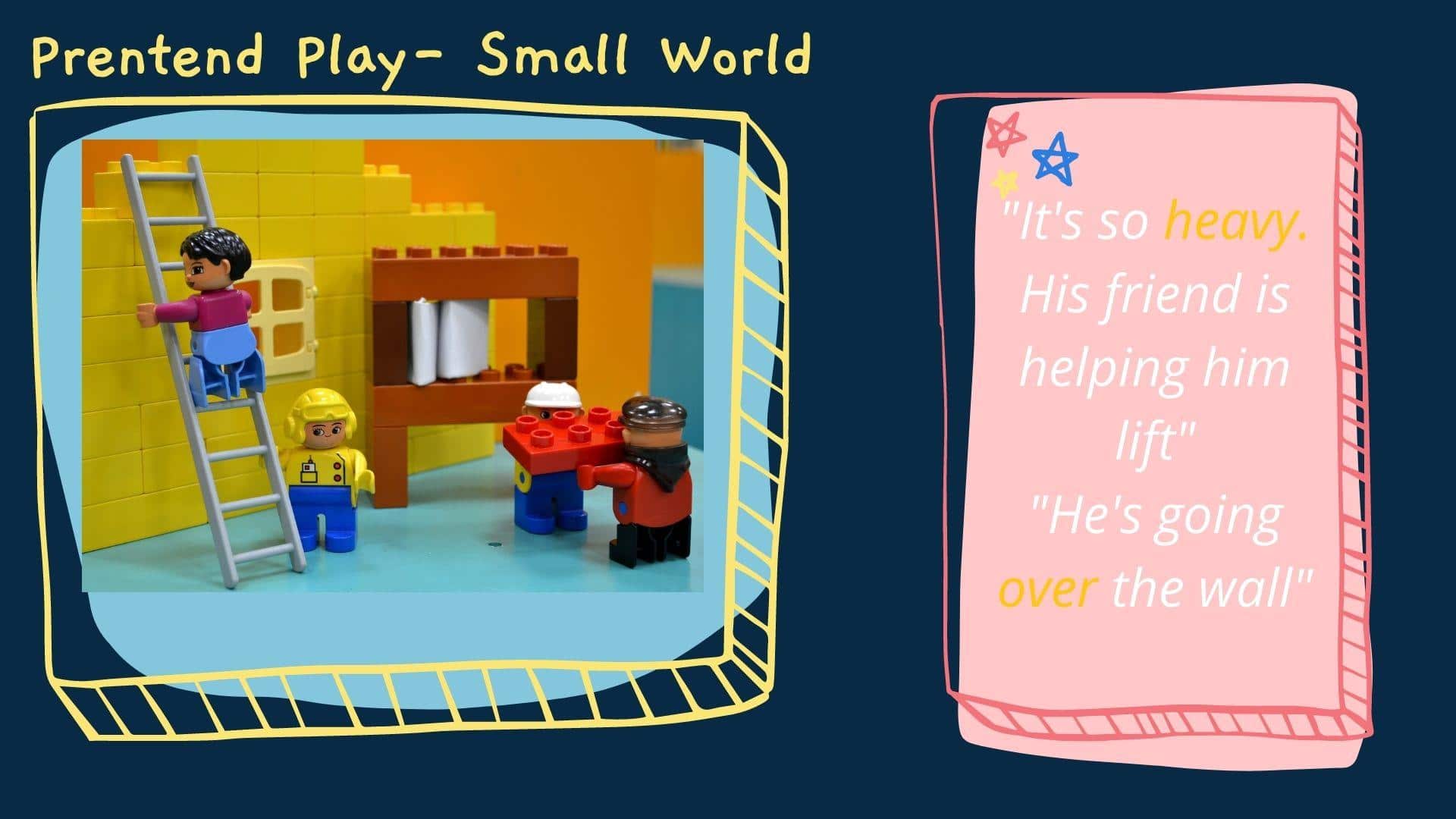 Small world play involves children using small-scale representations of real things like animals, people, cars and train sets as play props. Socio-dramatic play involves children playing with other children and/or adults. It provides opportunities for children to make friends, to negotiate with others, and to develop their communication skills. This play helps extend language. The ability to write stories also has its roots in socio-dramatic play.