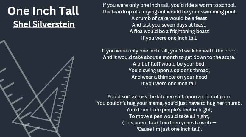 - Children could explore and create their own mathematical poems. Shel Silverstein’s work has been used as a stimulus. Richard Long’s text and art could be used as a stimulus for measurement and shape explorations.