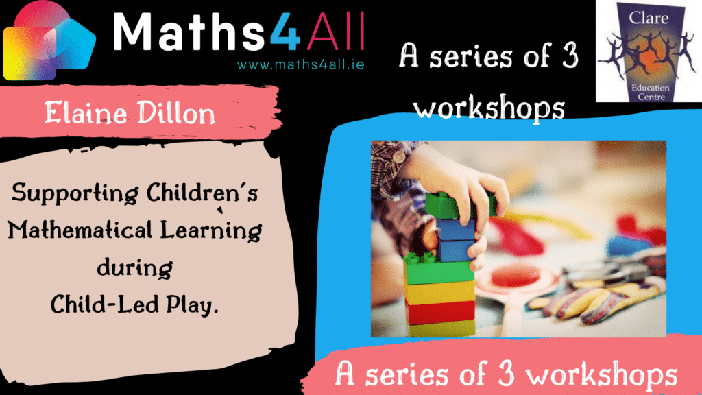 ‘Notice, Explore, Talk about Mathematics’ is an approach designed to develop children’s mathematical thinking during child-led play. Led by Elaine Dillon, an experienced infant teacher, this series of 3 online workshops aims to establish a Professional Learning Community that creates a space to reflect, collaborate and explore the value of noticing, exploring and talking about the mathematics that children play with during everyday child-led play.